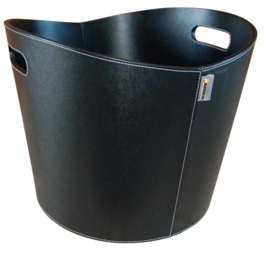 Koš na dřevo od značky Aduro s potahem z černé umělé kůže, bílým prošíváním, výškou 310 mm a průměrem 390 mm.