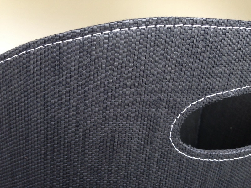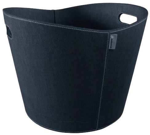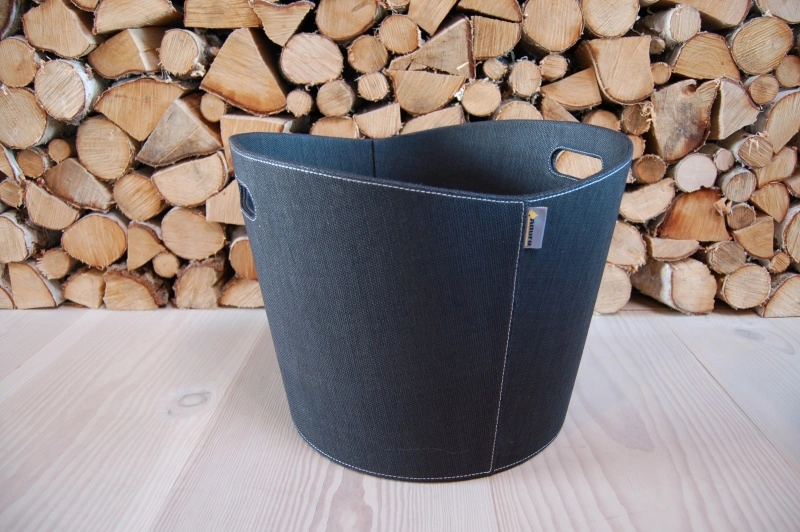 Koš na dřevo od značky Aduro s potahem z černé pevné látky, bílým prošíváním, výškou 310 mm a průměrem 390 mm.