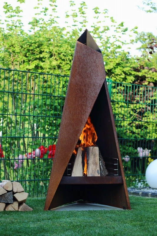 Heta Tipi L je unikátní designový venkovní krb a zároveň i venkovní gril díky vkládanému nerezovému roštu. Tento krb tvarem připomínající indiánské obydlí "típí" je vyrobeno z nízkolegované oceli (corten steel), která se svou ochranou proti korozi (rez vytváří ochranný štít) hodí pro každou zahradní architekturu. Díky této ochraně můžete krb nechat celý rok venku, čímž si získá originální patinu vnější rzí.