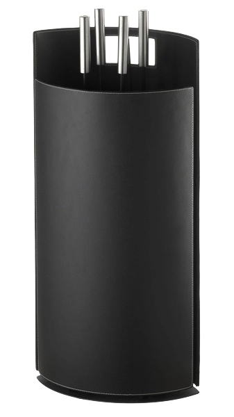 Designová sada krbového nářadí od značky Aduro se stojanem potaženým umělou kůží obsahuje smetáček, lopatku, pohrabáč a kleště na polena.