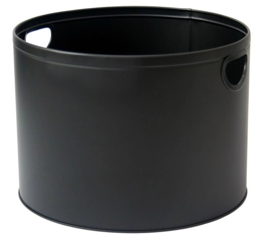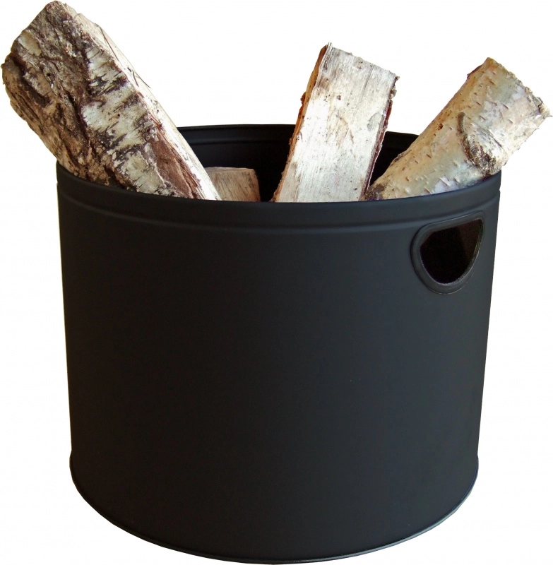 Kulatý kovový koš na dřevo od značky Aduro s plastovým lemováním rukojeti, výškou 320 mm a průměrem 440 mm.