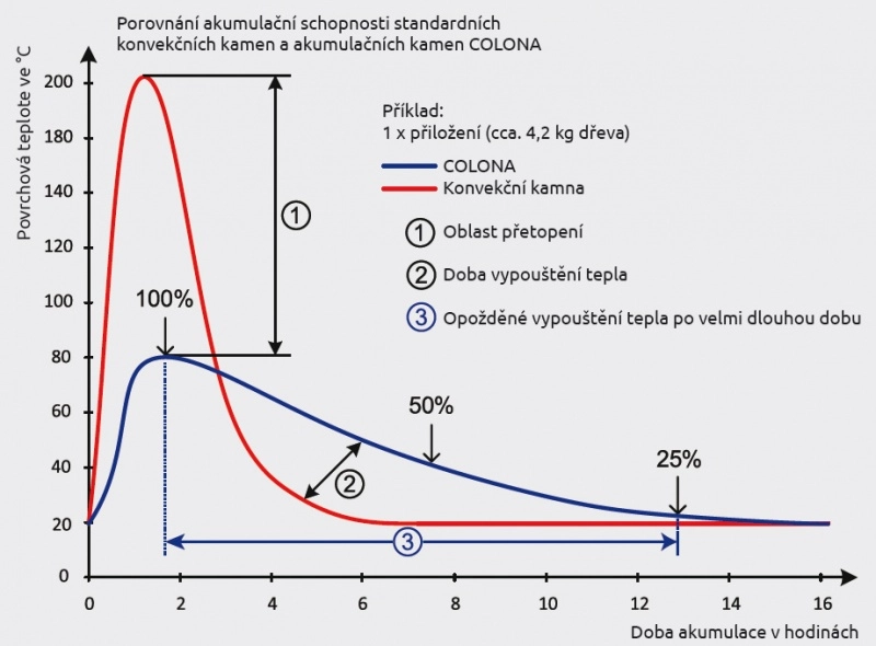 Akumulace funguje následujícím způsobem (níže uveden graf), použito 4,2 kg paliva (níže fotografie pro představu, kolik je 4,2 kg dřeva), teplota v místnosti 20 °C :
