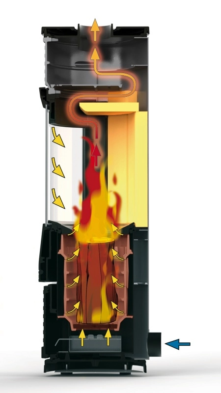Další výhodou je nízký výkon, malý půdorys (ovšem výška je 1,17 m!), takže jsou tyto kamna vhodná i do menších místností, ale nepůsobí malým dojmem. Tato krbová kamna mají velmi jednoduché ovládání pomocí jedné páčky, kterou ovládáte přívod primárního (pod rošt), sekundárního (oplach skla) i terciálního (dohořívání dřevoplynů) vzduchu.