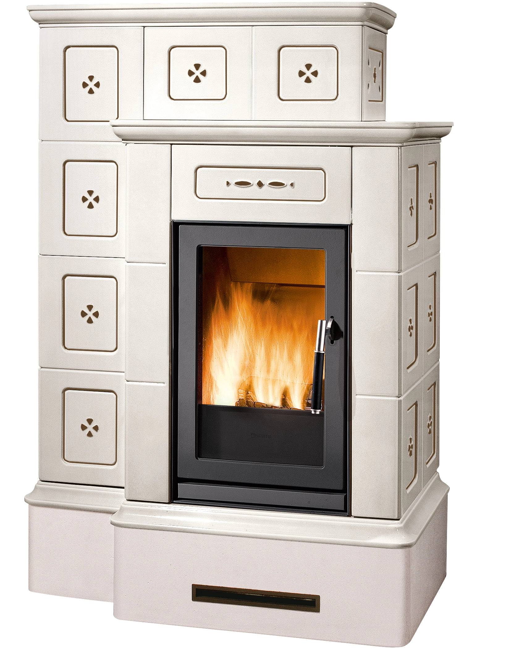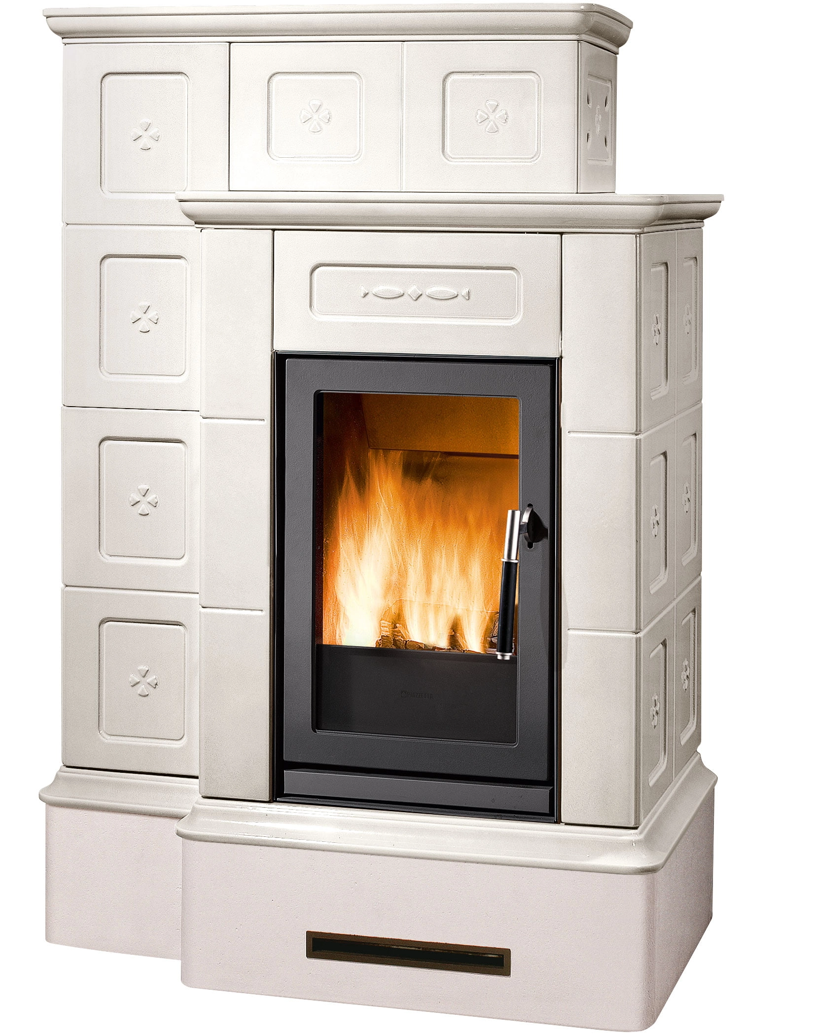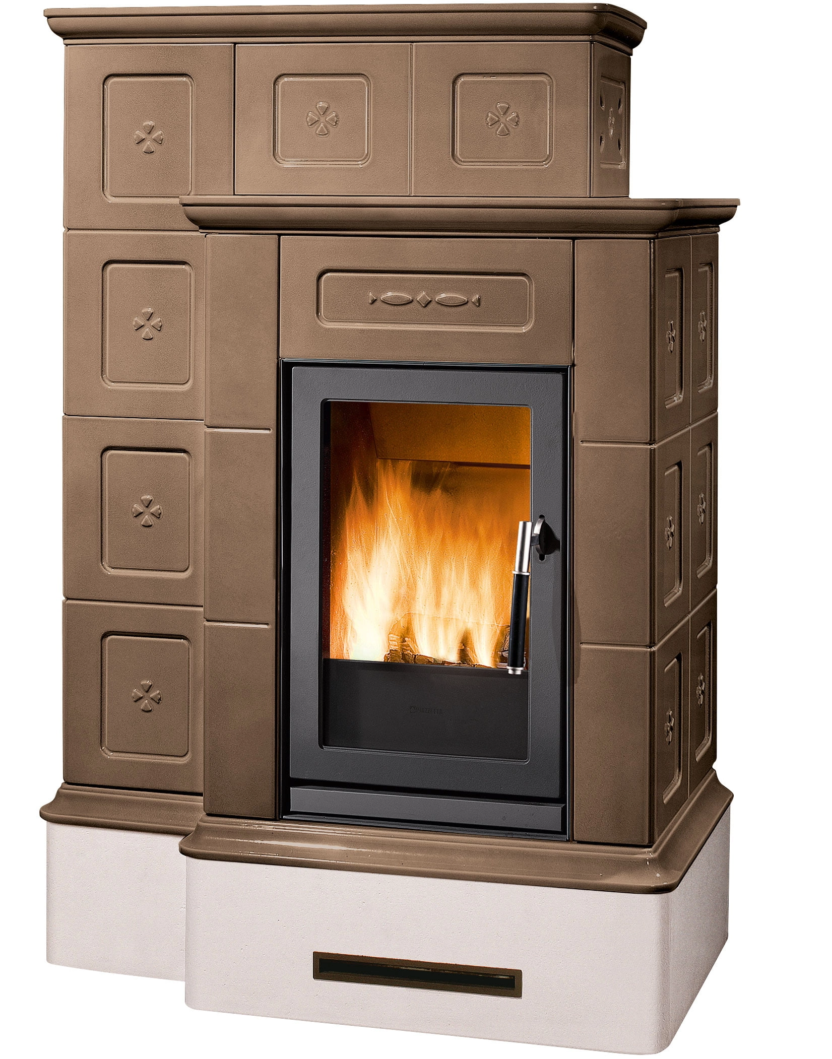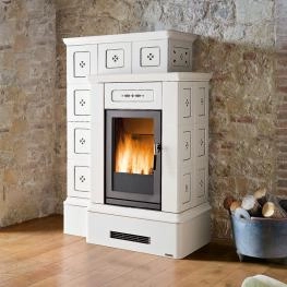 Masivní a dominantní obklad z keramiky se dvěma úrovněmi pro maximální vyzařovaný tepelný výkon a pro zajištění dlouhodobého pohodlí. Dostupné v těchto barvách: Bianco, Blu Verdemare, Canapa, Terra Bruna, Verde Mirto nebo Bianco Antico s ručně malovanými detaily. Nastavitelný přední výdech horkého vzduchu pro šíření konvekce. K dispozici také ve verzi BCS s automatickou regulací hoření.