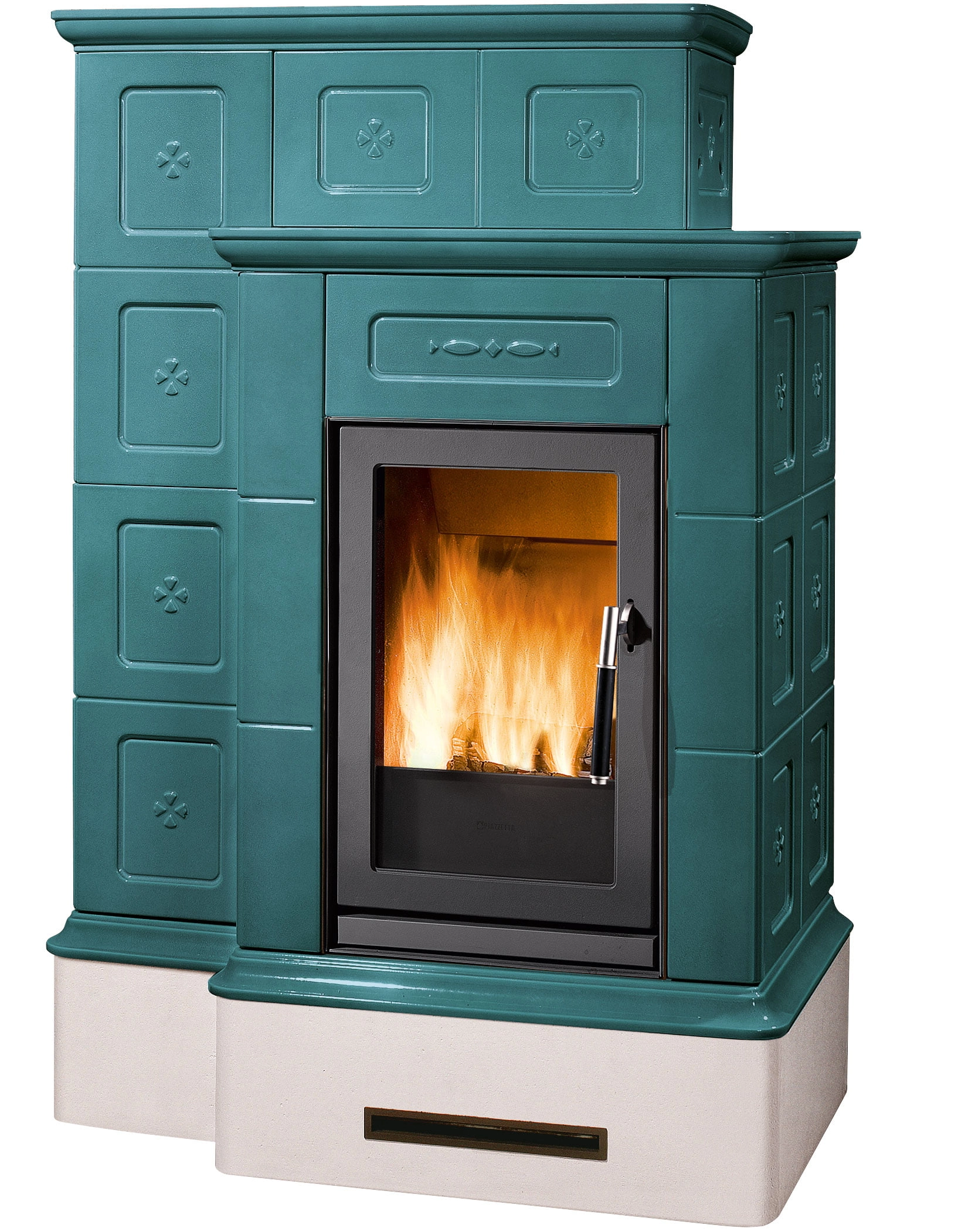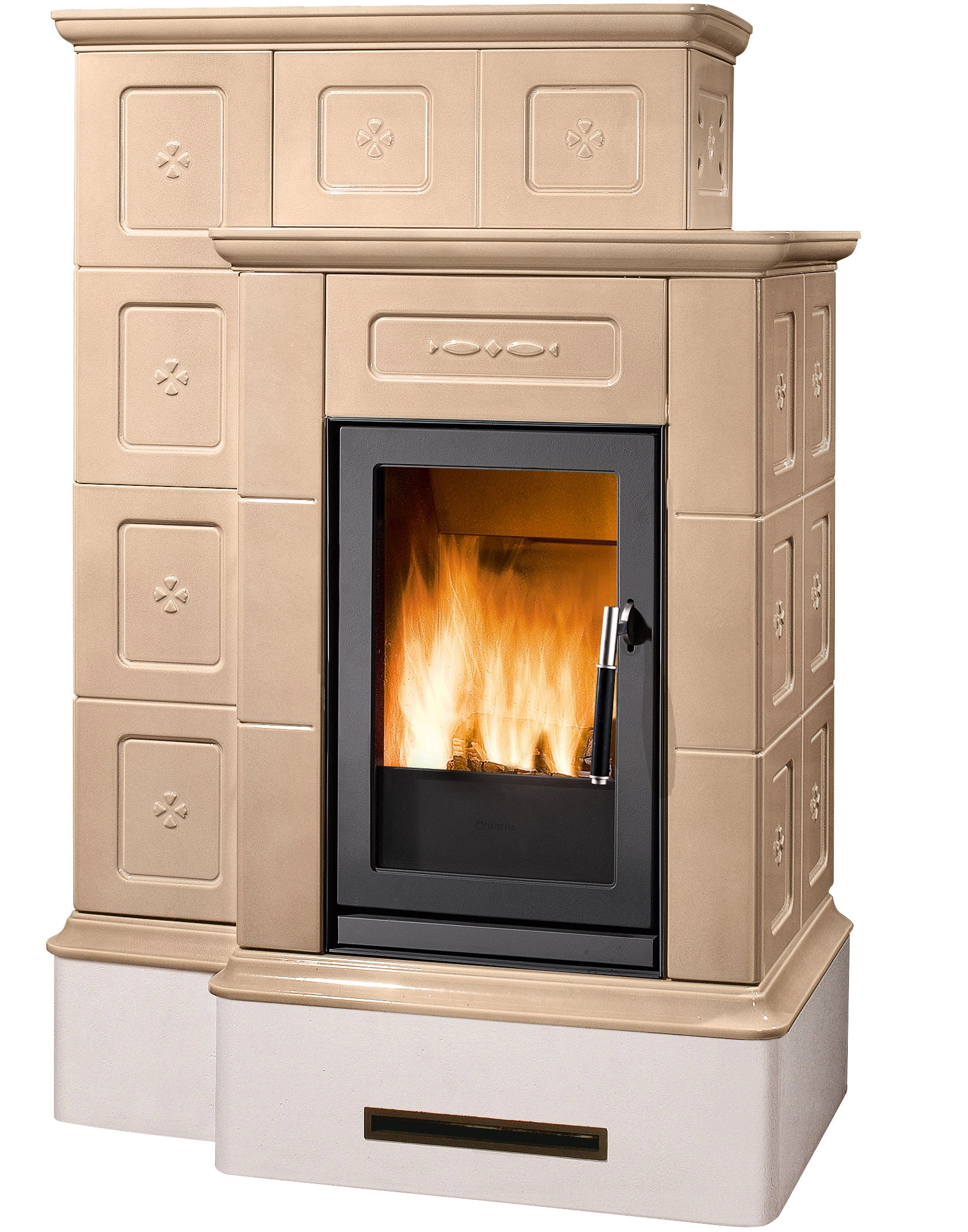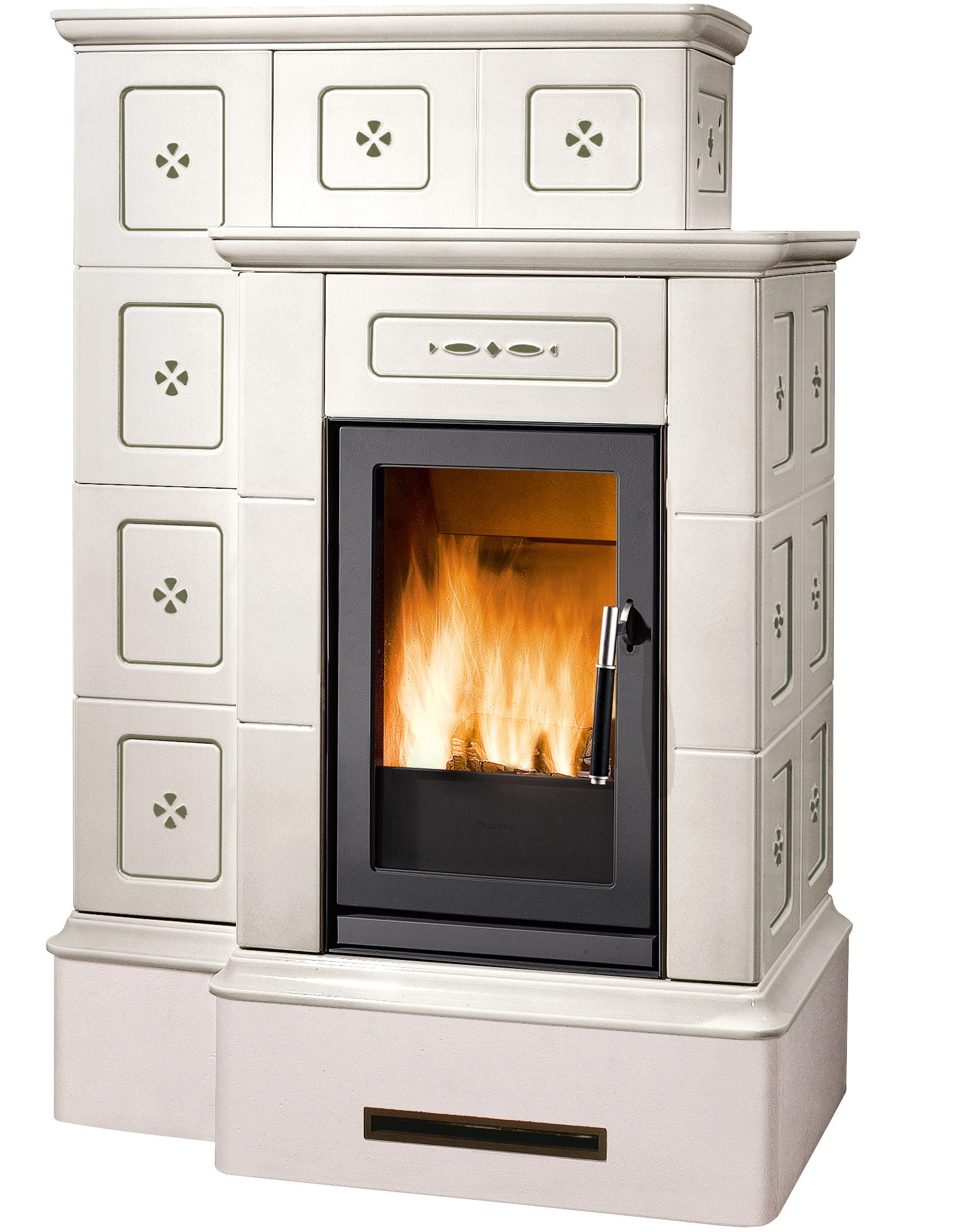 Masivní a dominantní obklad z keramiky se dvěma úrovněmi pro maximální vyzařovaný tepelný výkon a pro zajištění dlouhodobého pohodlí. Dostupné v těchto barvách: Bianco, Blu Verdemare, Canapa, Terra Bruna, Verde Mirto nebo Bianco Antico s ručně malovanými detaily. Nastavitelný přední výdech horkého vzduchu pro šíření konvekce. K dispozici také ve verzi BCS s automatickou regulací hoření.