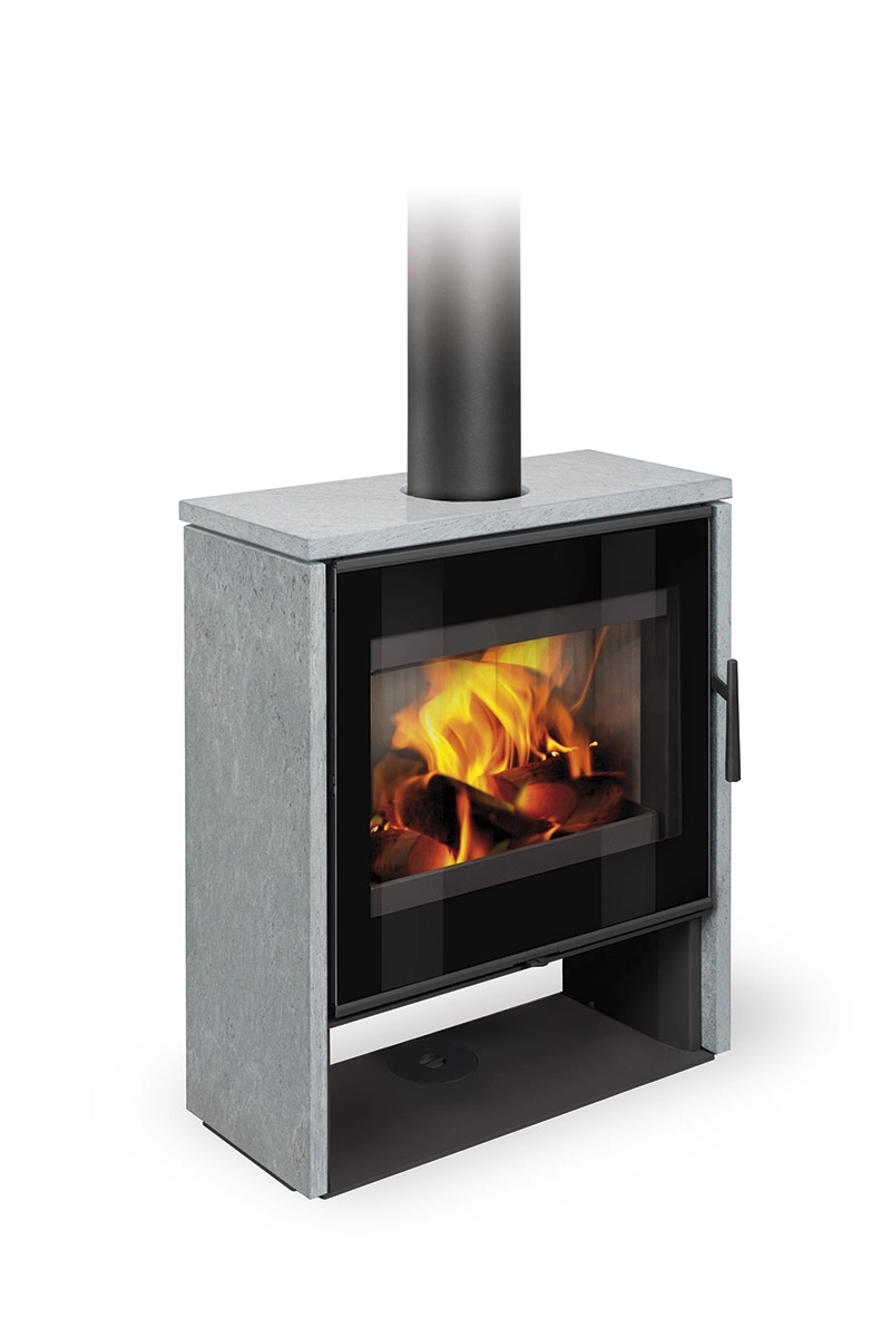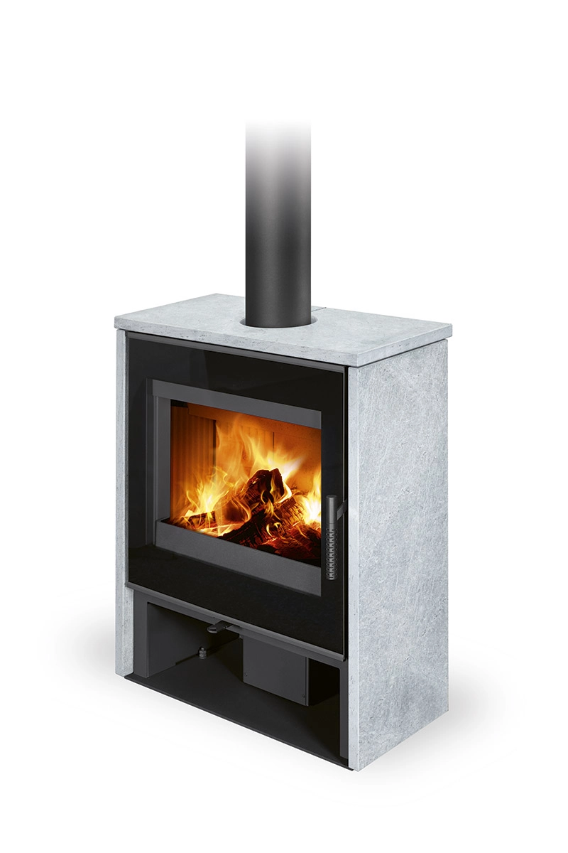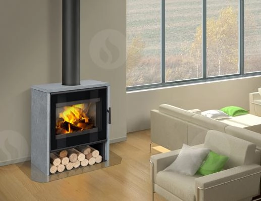 Elegantní krbová kamna s obkladem z šedého serpentinu, která skvěle zapadnou nejen do moderněji zařízených domácností.