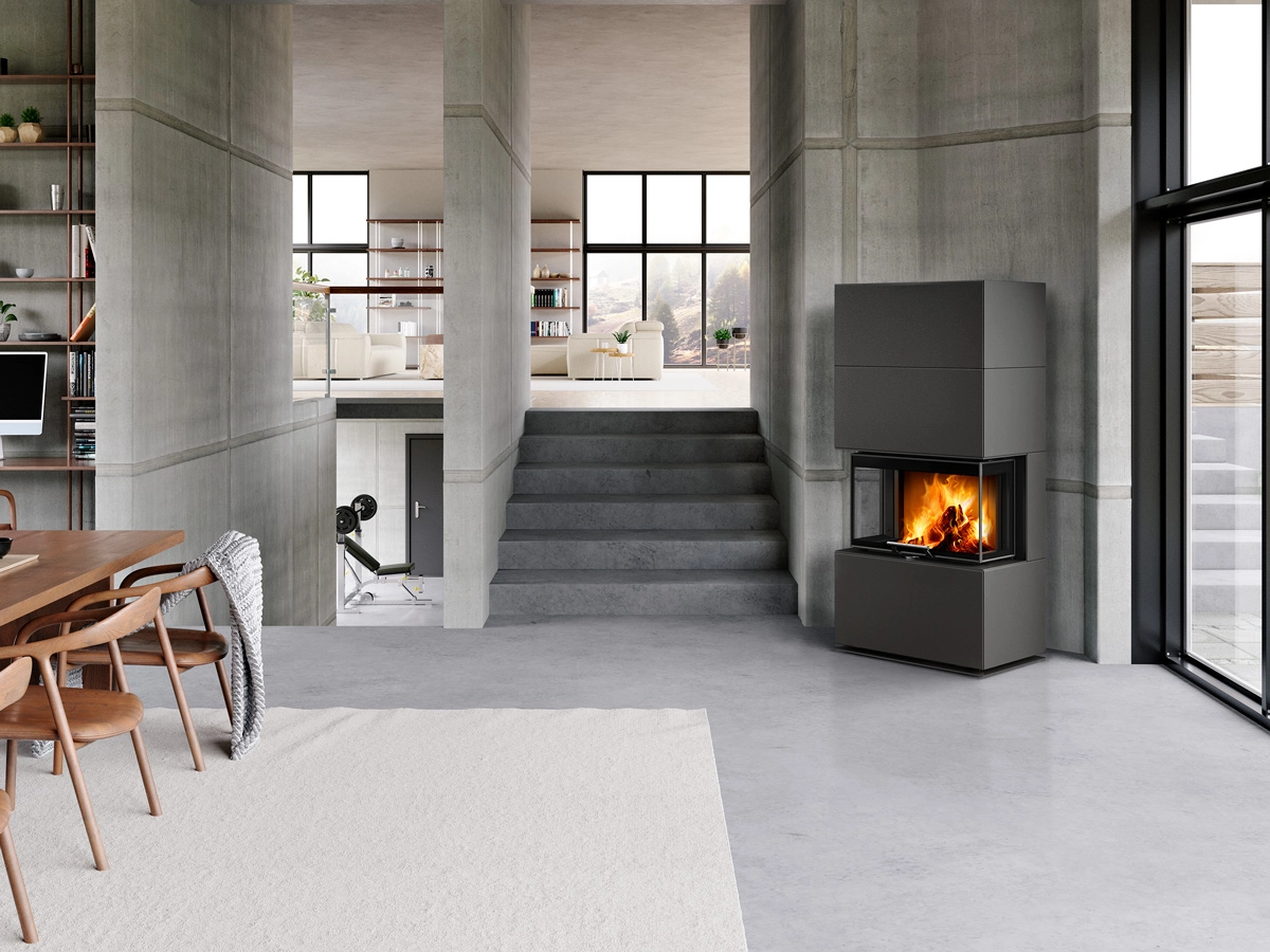 Krby řady CARA jsou obloženy velkoplošným přírodním kamenem nebo povrchově upraveným plechem. Odstínění zadního pláště je umožňuje umístit přímo ke stěně.