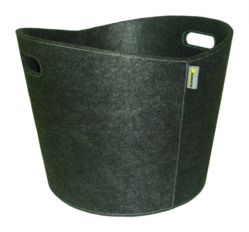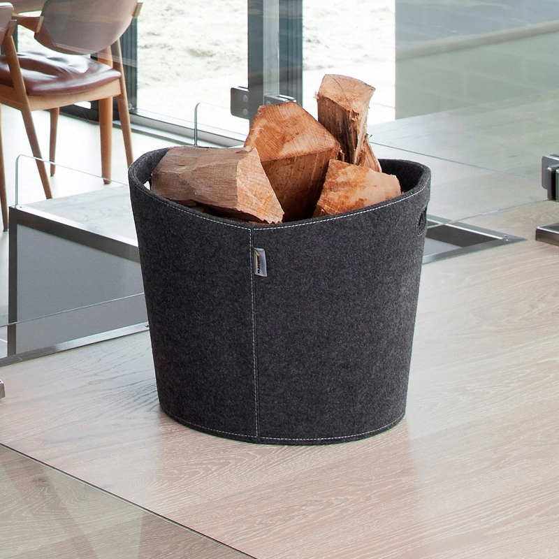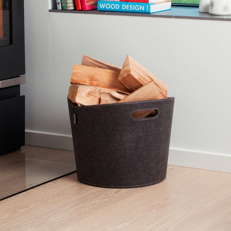 Koš na dřevo od značky Aduro s potahem z šedé plstěné látky, bílým prošíváním, výškou 310 mm a průměrem 390 mm.